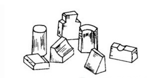 凡外形尺寸的比例在1:6以內,具有不多于2個凹角(包括圓弧狀凹角在內),或具有50o~70o的銳角,或帶有不多于4個溝槽(按總數計)的重量為2~15Kg的粘土質耐火磚和重量為2~18Kg的高鋁質耐火磚,命名為粘土質及高鋁質異型耐火磚。見下圖一