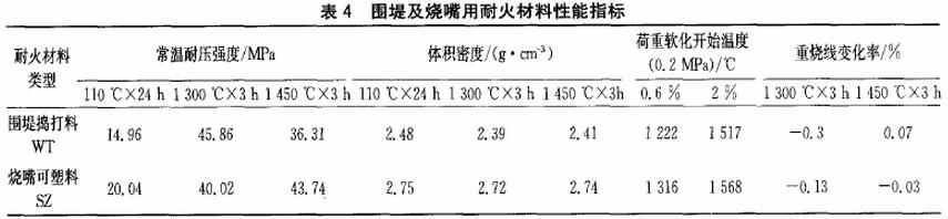 圍堤粘渣嚴(yán)重,阻礙了立柱的行程,圍堤也出現(xiàn)開裂,清渣時(shí)容易出現(xiàn)破損。其所用搗打料的性能如下表。變形量0.6%時(shí)圍堤搗打料的荷重軟化溫度為1222℃變形量2%時(shí)僅為1517℃,變形溫度的范圍比較寬,開始變形的溫度低,從1222℃變形量達(dá)到0.6%,搗打料容易發(fā)軟,粘渣就比較嚴(yán)重。燒嘴周圍搗打料形態(tài)穩(wěn)定,粘渣少,表明所用爐襯材料性較好,爐墻有內(nèi)陷、開裂情況,與搗打料的性能有關(guān)。圍堤及燒嘴所用可塑料的性能如表4.從表4看出,變形量0.6%時(shí),燒嘴可塑料的荷重軟化溫度為1316℃,而變形量達(dá)到2%時(shí)僅為1568℃,這個(gè)溫度區(qū)間比較大,荷重軟化溫度提高,對(duì)于減少粘渣有利。