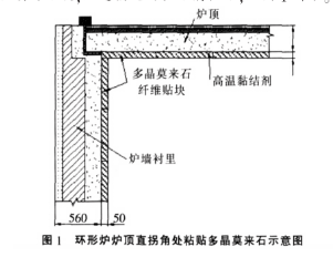 (3)在施工部位刷上一層高溫黏結(jié)劑(約7~10kg/m2),同時在多晶莫來石貼塊表面抹一層高溫黏結(jié)劑(約2kg/m2),將貼面塊保持10%~15%的壓縮量,粘貼于環(huán)形爐爐墻和爐頂工作面。