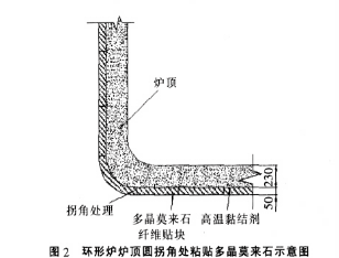 (8)爐頂圓拐角處粘貼多晶莫來石纖維貼塊,應(yīng)將貼塊按圓角處的形狀現(xiàn)場彎曲成原爐襯圓角形狀,確保貼塊的粘貼強度和此處的密閉、保溫效果,如圖2所示。