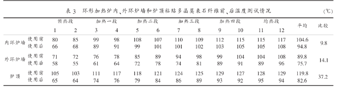 增加輻射傳熱,減少熱損失,降低燃料消耗多晶莫來石纖維的黑度為0.95,環(huán)形加熱爐內(nèi)襯粘貼多晶莫來石纖維后,爐內(nèi)熱輻射明顯增強,提高了爐子的加熱能力和管坯的加熱速度,尤其是環(huán)形爐加熱Φ220及以上大管坯時效果更為明顯。為了檢驗、對比使用效果,施工前、后(在同一生產(chǎn)條件下)分別在環(huán)形爐6個生產(chǎn)工藝段的內(nèi)、外環(huán)爐墻鋼板以及爐頂上各選定2個測溫點用紅外測溫儀進(jìn)行測溫,將測試溫度記錄并進(jìn)行比較,見表3。