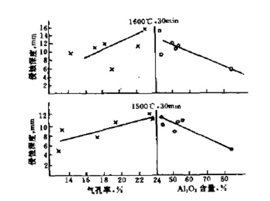 圖1 1500℃、1600℃時(shí)保溫30min的氣孔率、Al2O3含量與侵蝕深度的關(guān)系