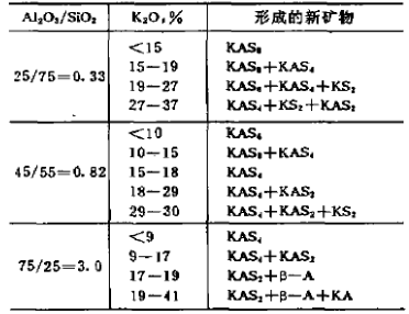 Al2O3/SiO2=0.82相當(dāng)于Al2O3含量45%的粘土磚,K2O含量>15%時,開始有白榴石形成,磚會發(fā)生“堿裂”。