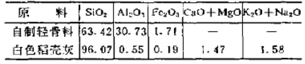 主要原料為自制輕骨料和白色稻殼灰。化學(xué)成分見表2,輕骨料的容量為1.61g/cm3、顯氣孔率為42%,耐壓強度27MPa。