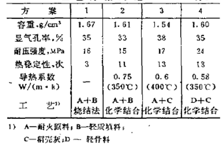 傳統(tǒng)的制造隔熱磚的方法是在原料中添加可燃物或輕質(zhì)填料,機壓成型并經(jīng)高溫煅燒而成,或直接用輕質(zhì)原料制作。其制品強度低,耐磨性差,不能直接作耐火襯里。本試驗選擇了幾種新工藝。其制品性能見表3。