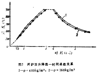 將圖1縫隙用散裝珍珠巖密封,厚度為5cm。將電爐功率控制在定值上(5kw),每隔一定時間記錄爐溫變化,并用測溫計測出兩個封口的保溫磚上表面的溫度值,然后作出升、降溫一時間函數關系圖,以及保溫磚表面溫度一時間圖,比較兩種保溫磚保溫性能。