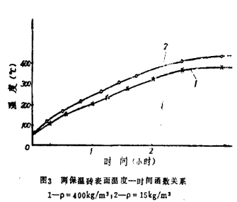 從圖2可以看出,密度大保溫磚比密度小的保溫磚早約7~8分鐘升到900℃,停電后降溫也慢。反復實驗結果相同,另一方面,從圖2可以看出珍珠巖保溫磚表面溫度也反映出密度大的平衡溫度低,保溫效果好。