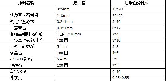通過選用具有多孔結(jié)構(gòu)的輕質(zhì)莫來(lái)石骨料、氧化鋁空心球和導(dǎo)熱系數(shù)較小的含鋯高鋁耐火纖維, 達(dá)到提高爐輥保溫性能, 減少冷卻水帶走的熱損失, 同時(shí)降低體積密度, 減少爐輥的重量與轉(zhuǎn)動(dòng)的動(dòng)力消耗的目的;通過0.1~1 mm的焦寶石的加入, 彌補(bǔ)了小于1 mm輕質(zhì)骨料性能劣化的不足, 并通過焦寶石優(yōu)良的熱震穩(wěn)定性與高溫性能, 提高了澆注料的綜合使用性能;通過使用水泥、二氧化硅和-Al2O3微粉作為復(fù)合結(jié)合劑, 引入水合結(jié)合和凝聚結(jié)合兩種凝結(jié)硬化機(jī)理, 提高材料的低、中和高溫強(qiáng)度;通過加入少量鋰輝石粉的燒結(jié)促進(jìn)作用, 改善澆注料使用條件下的燒結(jié)狀況, 促進(jìn)爐輥澆注料隔熱襯使用條件下高溫陶瓷結(jié)合相的形成, 提高隔熱襯的抗破損能力;通過添加含鋯高鋁耐火纖維, 利用其在基體中的拉拔作用所產(chǎn)生的增強(qiáng)、增韌效應(yīng), 提高爐輥澆注料抗機(jī)械振動(dòng)能力和抗沖擊韌性;通過添加藍(lán)晶石粉作為膨脹劑, 利用藍(lán)晶石高溫下不可逆分解為莫來(lái)石和游離的Si O2而產(chǎn)生體積膨脹, 抵消澆注料高溫下體積收縮, 防止?jié)沧⒘吓c金屬輥身之間熱膨脹不匹配造成的澆注料層開裂和脫落;通過減水劑、有機(jī)消泡劑和硅烷偶聯(lián)劑等外加劑的使用, 提高了澆注料的施工流動(dòng)性, 降低了澆注料的加水量, 改善了爐輥澆注隔熱襯施工質(zhì)量與綜合性能。