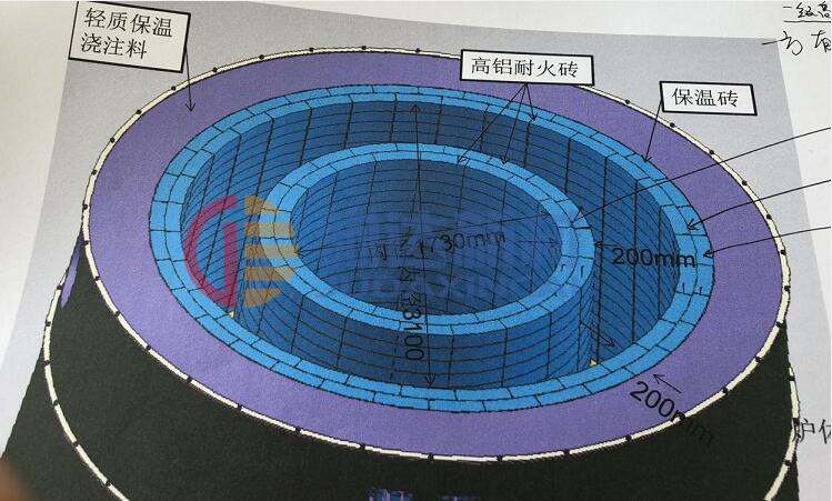 我公司根據(jù)相關(guān)資料設(shè)計(jì)內(nèi)襯耐火材料使用的磚型為萬(wàn)能弧耐火磚,改雙層壁厚為單層壁厚,萬(wàn)能弧耐火磚型尺寸定為280X200X100(mm),下圖(1)為我公司設(shè)計(jì)圖紙,砌筑方法為:外層緊貼爐殼為輕質(zhì)保溫澆注料體積密度為1.3g/cm³,內(nèi)層為萬(wàn)能弧耐火磚,單層砌筑每圈需要數(shù)量為39塊,下圖為設(shè)計(jì)方案(2)。